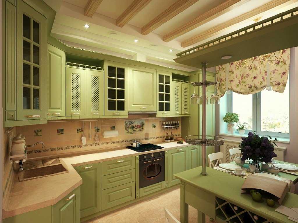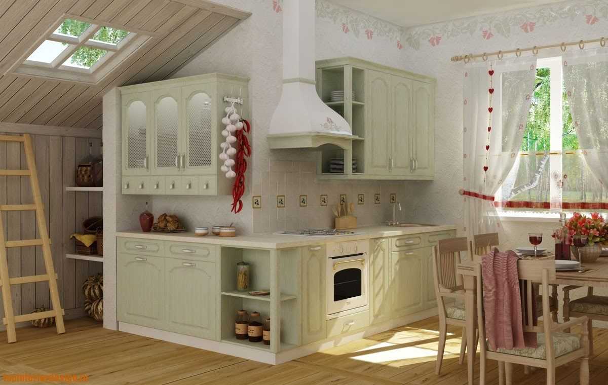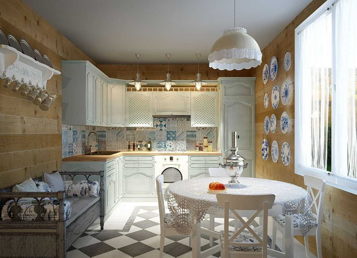 Кухня в стиле прованс прекрасно впишется в обстановку деревянного дома. Для создания особого колорита можно не зашивать часть деревянных стен и потолка, остальную отделку подобрать в тон деревянной поверхности.