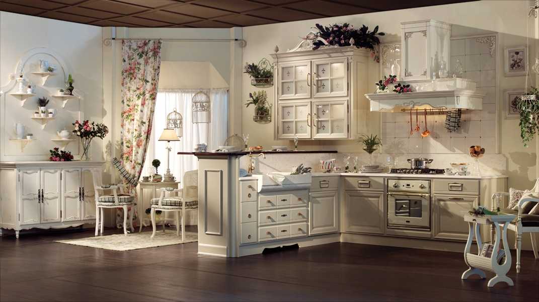 Если рассматривать другие настенные элементы и аксессуары, то это декоративные тарелки, открытые настенные полки, на которые ставятся кувшины и любая другая посуда, птичьи клетки и цветы, причем особое очарование будут придавать засушенные букеты. Эти и другие аксессуары создадут необходимый колорит, и даже расскажут что-то о хозяевах.