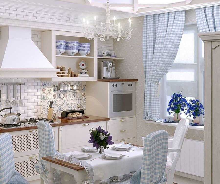 - Дизайн кухни и гостиной в стиле прованс отличается изобилием нежного текстиля – с растительным узором, мелким орнаментом, вышитого и ажурного.