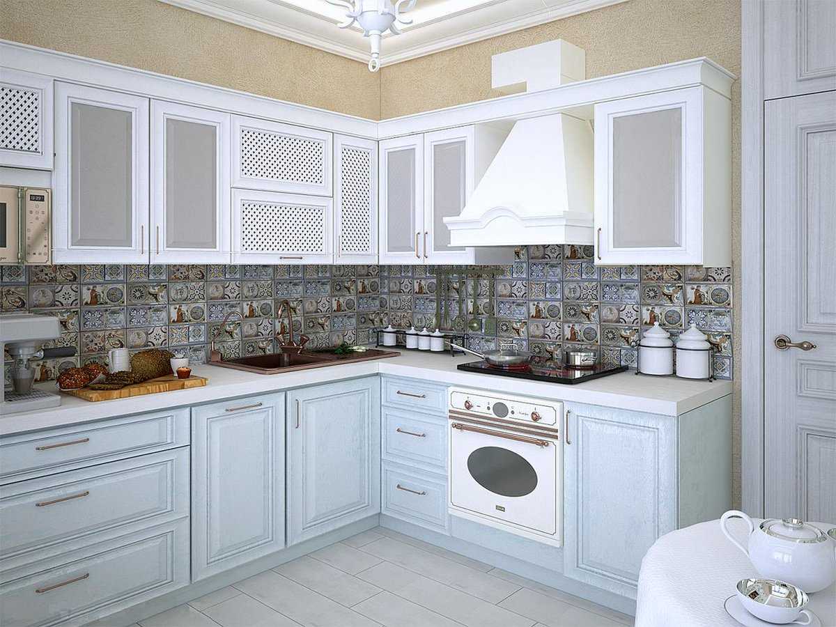 Для отделки рабочей зоны на кухне лучше всего использовать плитку. Это могут быть небольшие квадраты 10х10 см с объемным декором либо плитка «кабанчик» пастельных оттенков или белая. Великолепное решение для прованса – это плитка, выполненная в технике пэчворк, когда на одну поверхность наносятся разные рисунки. Украсить стены можно керамическим панно соответствующей тематики.
