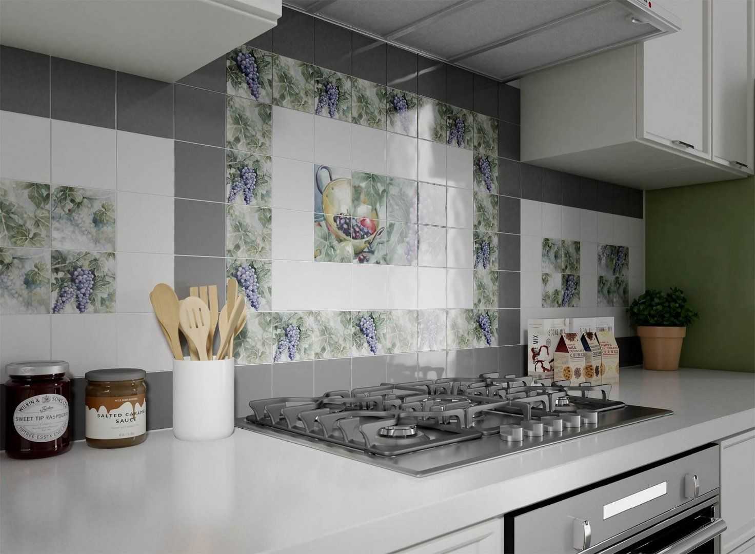 Белый «кабанчик» выбирают чаще, чем другие оттенки. В основном плитка однотонная и глянцевая. Цвет может быть насыщенным, но не кричащим. Также встречаются коллекции с фотопечатью. Зачастую на декоративных элементах изображают ягоды, траву, цветы, фрукты и другие символы, дополняющие кулинарную тему.