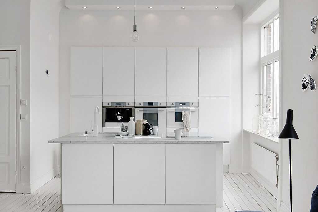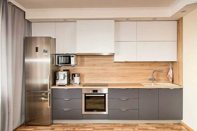 Для решения данной проблемы в интерьеры прямоугольного кухонного помещения с холодильником стоит выбирать линейные гарнитуры, длина которых превышает 4 метра, но в этом случае в процессе готовки будет уходить больше времени на передвижения между крайними секциями.