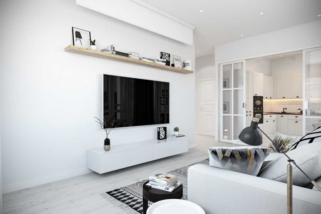 ТВ в окружении навесных полок — практичный прием в гостиной