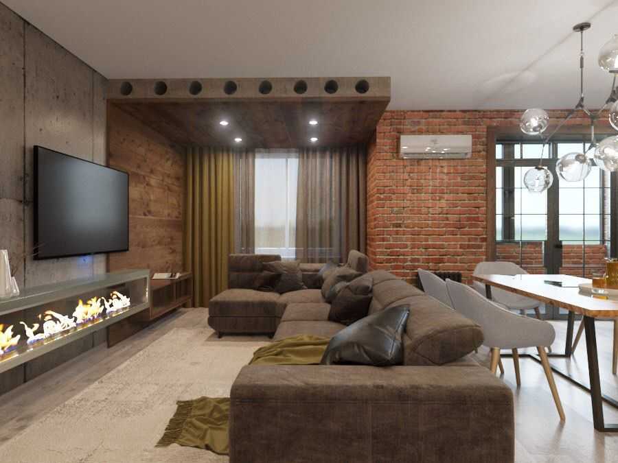 Предполагает размещение крупного новейшего телевизора с кирпичной отделкой. Под телевизором находится тумбочка с современной техникой.