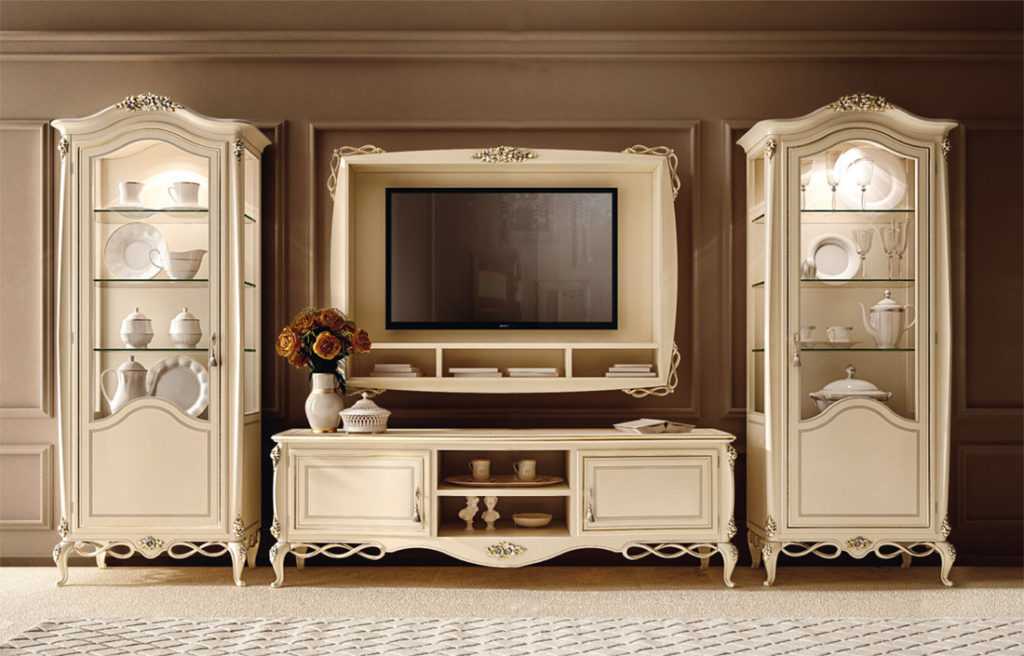 Функциональная стенка для хранения может выглядеть как открытые полки или рядом шкафов. Здесь также может быть возможность скрытия телевизора, когда он не используется, за дверцей. Такие блоки отличаются тем, что могут быть разной формы. Наиболее удобная – это угловая модель с отдельной нишей под ТВ необходимого размера. Такие блоки хороши тем, что могут содержать достаточно отделений для размещения колонок, DVD, игровой приставки и прочего.