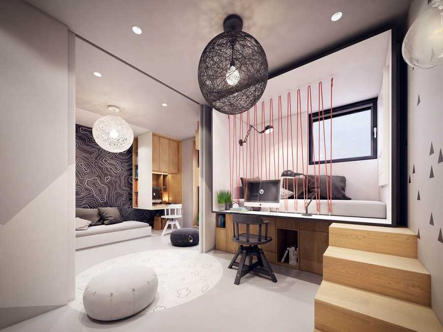 Необычным решением будет создание подиума — небольшого возвышения. Это не только визуально выделит детскую, но и будет отлично смотреться в интерьере комнаты. Подиум можно создать в углу и поставить на него кровать, письменный стол, шкаф или стеллаж.