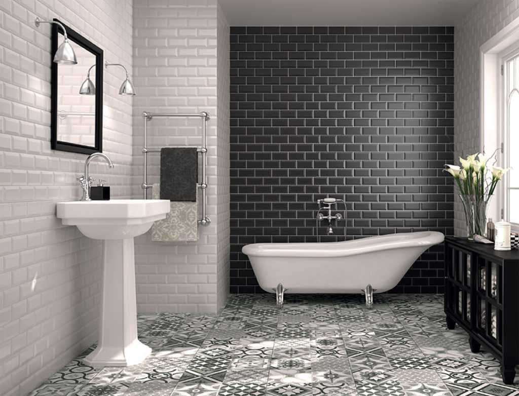 - Черный — обычно применяют для больших комнат. При отделочных работах нужно учитывать, что темную плитку необходимо сочетать со светлой (белоснежной, телесной). В узких помещениях рекомендуется оформить материалом одну стену, изменив этим ее геометрию.