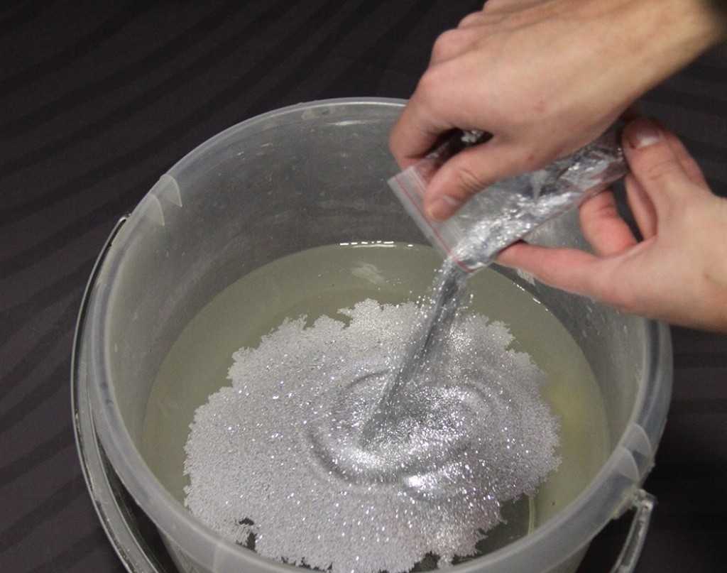 - Наполнители лучше смешать сначала с водой, необходимой для растворения смеси, а потом всыпать в воду с наполнителями волокна с клеем из таза. Так, наполнители смогут распределиться более равномерно.